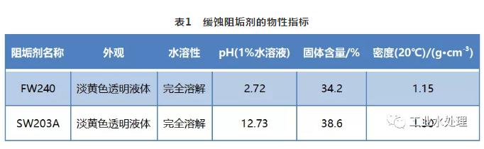 FW240是聚羧酸類酸性阻垢劑,特別適合高pH、高堿度、高硬度的水質。SW203A是以馬來酸酐為原料生產的可生物降解的堿性緩蝕阻垢劑,在海水體系中具有優良的阻垢分散作用。FW240和SW203A均為無磷、高效緩蝕阻垢劑,其物性指標見表1。
