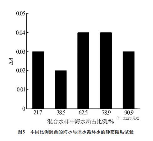 由圖3可知,各種比例混合的水樣試驗后的ΔA在0.02~0.04之間,均小于0.2。表明在海水注入淡水循環水過程中,海水中投加12 mg/L的緩蝕阻垢劑FW240,可以起到良好的結垢控制作用。