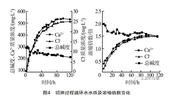 由表2可知,切換前已將淡水循環水堿度調節至288 mg/L。由圖4可知,補水切換為海水過程中,開始時系統中Cl-、Ca2+濃度急速上升,堿度緩慢下降,之后各離子濃度變化變緩,并趨于穩定,以不同離子濃度計算的濃縮倍數逐漸接近,穩定在1.5左右。