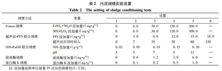 分別量取 50 mL 污泥樣品,對其先后進行不同方式的調理( 表 2) 。其中,Fenton 調理和 SDS-NaOH 聯合調理實驗將污泥樣品置于磁力攪拌機上攪拌 1 h,超聲波-PFS 聯合調理實驗時超聲波頻率為 40 kHz,溶菌酶調理和蛋白酶 K 調理實驗將污泥樣品恒溫水浴并攪拌 1 h,取出后進行污泥泥餅含水率和 CST 的測定。