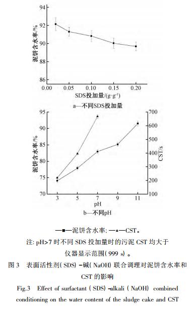 2. 3 表面活性劑( SDS) -堿( NaOH) 聯合調理對污泥脫水性能的影響