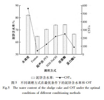圖 5 對比了各調理方法在最優條件下所得污泥的泥餅含水率和 CST。可知: 各調理方法能不同程度地降低污泥的泥餅含水率和 CST,提高污泥的脫水性能。Fenton 調理的效果最為突出,泥餅含水率下降17. 26 百分點,CST 下降 520. 6 s,其次依次是蛋白酶K 調理、超聲波-PFS 聯合調理、SDS-NaOH 聯合調理和溶菌酶調理。其中,SDS-NaOH 聯合調理的最優pH 均為 3,NaOH 的協同作用反而使污泥脫水性能惡化。溶菌酶調理和蛋白酶 K 調理效果對比表明蛋白酶 K 更能促進污泥中水分的脫除,可能是由于蛋白酶 K 不僅能促進污泥中微生物細胞結構的水解,還能水解污泥中原有的和細胞破解后釋放的有機物質。
